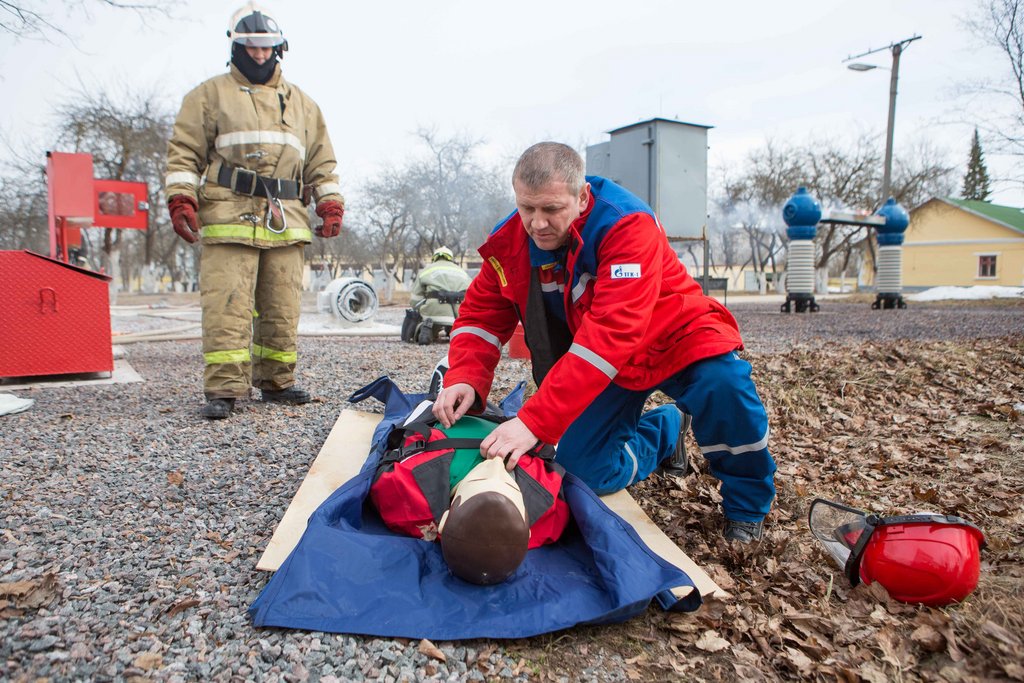 Машинист гидроагрегата обнаружил пострадавшего – на сотруднике станции загорелась одежда. Машинист тушит своего коллегу (в данном случае, чтобы во время учений не пострадал реальный энергетик – манекен), начальник смены станции оказывает пострадавшему первую медицинскую помощь, но тот все еще находится без сознания.