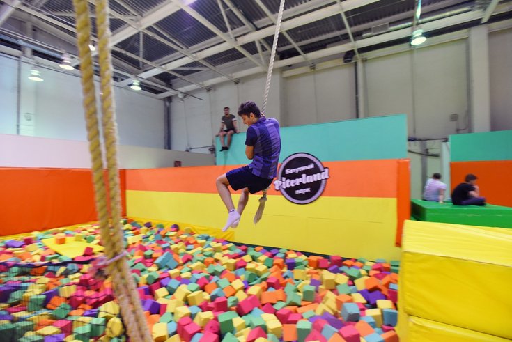 В батутной зоне ребята практически научились летать: это не сложно, когда под ногами упругая сетка, а приземление после кульбита в бассейн с мягкими поролоновыми кубами.